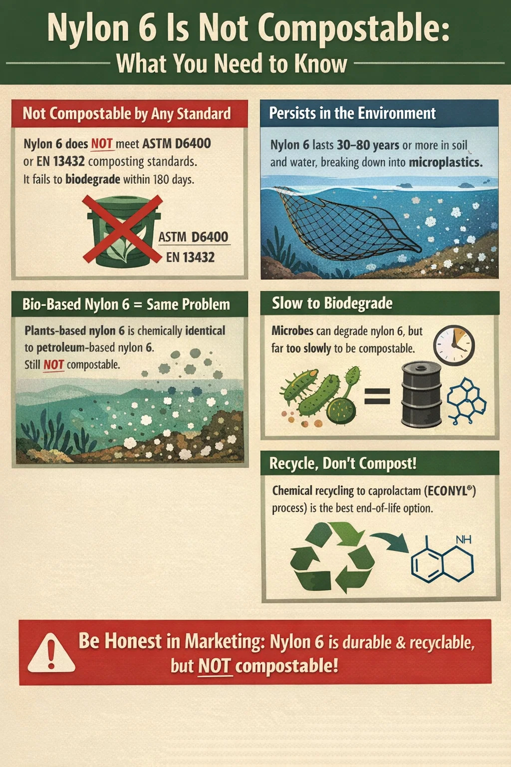 - Ikke merk produkter som inneholder nylon 6 som komposterbare, biologisk nedbrytbare eller "returnerer til naturen" - dette er unøyaktig og utgjør i mange markeder et regelbrudd i henhold til miljøkravslovgivning.