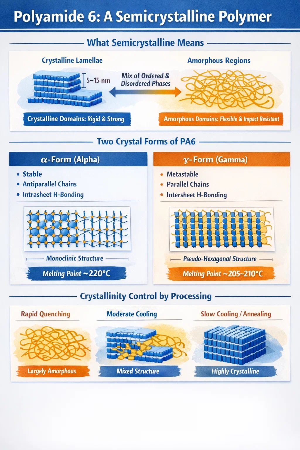En vanlig misforståelse er at PA6 enten er "krystallinsk" eller "amorf" avhengig av hvordan den behandles. I virkeligheten skifter andelen av hver fase med prosessforhold, termisk historie og fuktighetsinnhold — men begge fasene er alltid til stede i en viss grad i fast polyamid 6. Bråkjølt PA6 kan ha en krystallinitetsindeks så lav som noen få prosent, mens sakte avkjølt eller glødet materiale kan nå rundt 35 %. Ingen av ytterpunktene produserer et materiale som er rent den ene eller den andre fasen.