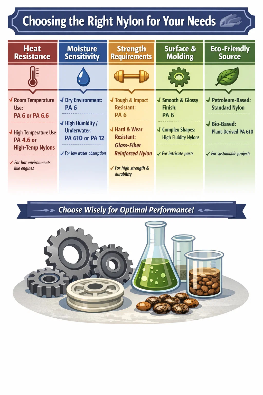 Generell husholdning eller vanlig industriell bruk: Hvis delen kun fungerer i romtemperatur eller i et mildt miljø, er den klassiske Polyamid 6 eller PA 6.6 vil være tilstrekkelig. De er kostnadseffektive og kan håndtere de fleste hverdagssituasjoner.