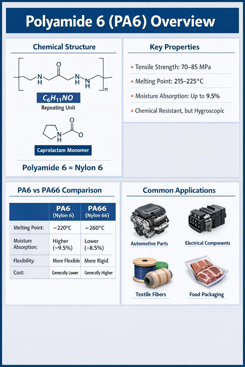 Polyamid 6 syntetiseres gjennom den hydrolytiske ringåpningspolymerisasjonen av e-kaprolaktam, et syklisk amid. Denne prosessen skiller seg fundamentalt fra Polyamid 66 (PA66), som er laget ved kondensasjonspolymerisering av to separate monomerer - heksametylendiamin og adipinsyre. Den enkeltmonomer opprinnelsen til PA6 gir den en mer jevn og litt mer fleksibel kjedestruktur sammenlignet med PA66.