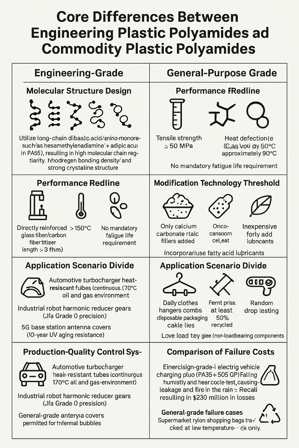 Kjerneforskjeller mellom Engineering av plastpolyamider og råvareplastpolyamider
